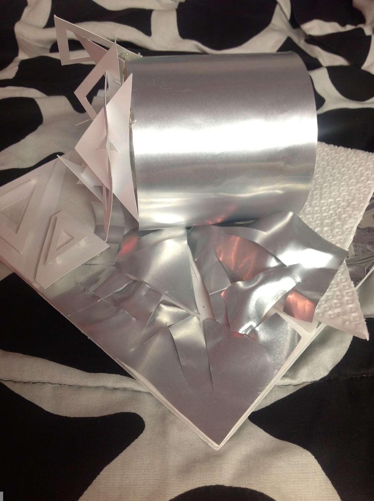 Instead of my architectonic sculpture made out of repurposed materials being made to be viewed on a horizontal plane, it is meant to be viewed vertically, or as an installation piece. It is meant to be viewed this way because I wanted to focus on the weaving on the base of the foam core. The reflection from the background catches the viewers eye and the simplicity of the design lets the viewer focus on the elements inspired by the concept. I went through 3 different versions of the project derived from the same concept: Tribal print, navajo sand painting and blankets, and cactus flowers from that region. In this project I used: the ‘Smart Pop’ popcorn wrapper, condiment paper cups, water containers and broken plastic.